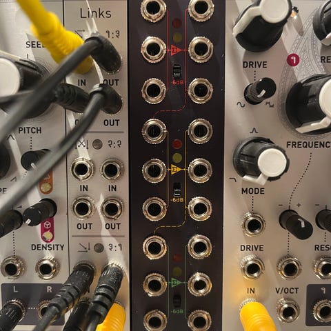 4 stereo indgange med vca for hver kanal + 1 direkte mono in så du behøver ikke at have ekstra vca moduler. 2 aux sends og stereo ud. Kun 18 hp! Hver kanal kan være pan eller crossfade, aux kan være pre/post volume knob. Mute knap per kanal.
