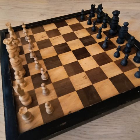 Lille hyggeligt skak-spil på papplade med brikker i plast.