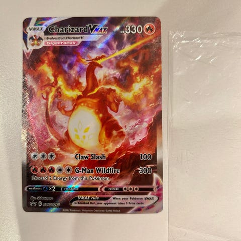 Pokemon Charizard VMAX samlekort. Ikke ratet, men er nok en 10'er. Perfekt stand. Efter kortet blev pakket ud, kom det direkte i fast sleeve og kun taget ud for at tage disse billeder. Sender gerne med forsikring for køber med “Fiks færdig” her i appen