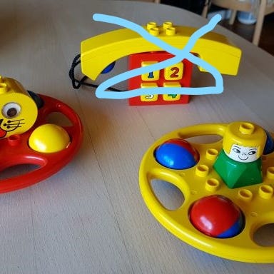 Rangle fra Duplo - Lego. Kan også bruges som bund til at bygge noget oven på som s¨kan trækkes rundt. Kuglerne kan dreje rundt og de rasler.