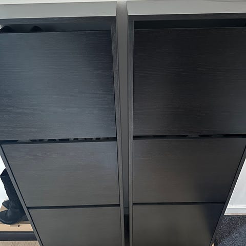 Space-saving shoe cabinet with 3 compartments. Each compartment has a divider so you can fit double rows of shoes (~6 pairs per compartment).