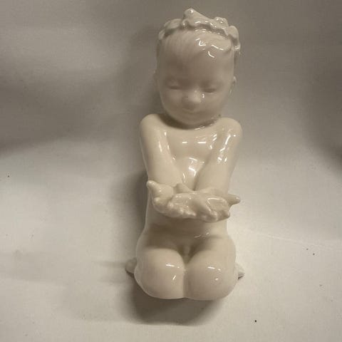 Figuren viser et barn som krammer en søhest. Materialet ser ud til at være keramik i en glat, blank overflade. Huden er lys og detaljer er nøje udført.