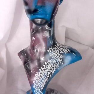 Denne kunstneriske byst tiltrækker øjet med sin modige brug af farver og mønstre. Fremstillet af et glat, skulpturelt materiale er overfladen malet i en levende grøn farve, der står i kontrast til indviklede hvide mønstre. Hvide linjer og symboler flettes sammen og skaber en graffiti-agtig effekt, der dækker personens ansigt og overkrop. Det udtryksfulde, fint tegnede blik giver bysten en aura af mystik og eftertænksomhed. Værket udfordrer den kunstneriske