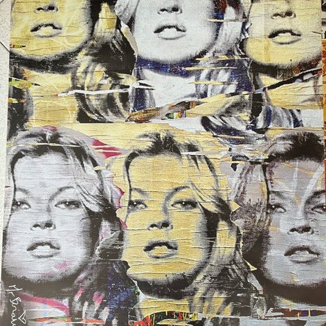 Flot kombination af silketryk og collage-teknikker. Ronald Chapeau bearbejder dette bagefter med tyk akrylmaling. Spændt op på et lærred på 4 cm tykkelse, hvis kanter er gennemmalede, så den kan hænges direkte op på væggen!