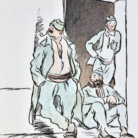 Smukt sæt bestående af 95 illustrationer af Jean Bruller (1902-1991), lavet til La Danse des Vivants, inklusive to originale graveringer signeret af kunstneren (med titlerne "Le radeau de l’Éternelle Espérance" og "Le Roi") og en original tegning udført i kanten af en plade.