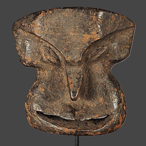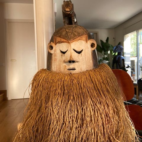 Maske heaume Igbo, træmaske fra Nigeria af Igbo‑kulturen, 1 stk., 43 cm høj, 34 cm dyb, 23 cm bred, vægt 2 kg, provenance Privécollectie, leveret med stand, i god stand. Klik på den blå "gå til varen" knap, for at købe eller byde på denne vare. Den samlede pris vil blive vist inden du afgiver dit bud.
