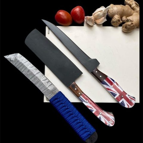 Dette er en bemærkelsesværdigt smedet og håndfastgjort køkkenkniv udformet af de bedste knivmestre i USA. Dette er en meget smukt håndlavet Premium Quality lammehorn håndlavet samler-køkken-lommekniv, flerlaget smedet stål, læderhylster. Kniven har et behageligt greb. Bladet er af særligt smedet stål med en høj skærekant. Kniven er lige så meget et samlerobjekt som et nyttigt køkkenredskab. De åbne foldeknive har en cirka 22 cm længde.