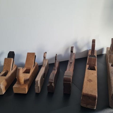 Lot med 11 gamle værktøjer til værksted til smed og snedker, nogle af militært oprindelse, mærke Rubino, Norm-Mess, Peugeot; oprindelse fra forskellige europæiske lande — Tyskland, Italien, Frankrig.