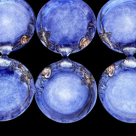 Elegant sæt med 6 bestik til skaldyr (type små gafler / grillspyd til krebsdyr), fremstillet i alpacca (sølvfarvet legering), tilhørende Atlante Collection-linjen.