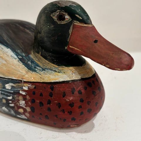 Antik hollandsk jagtdoek til and, håndhugget i træ (balsa) og håndmalet, circa 1920–1940, mål 37 × 16 × 16 cm, vægt 590 g, i god brugt stand med små aldersmærker og konservativ halsrestaurering. Klik på den blå "gå til varen" knap, for at købe eller byde på denne vare. Den samlede pris vil blive vist inden du afgiver dit bud.