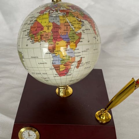Verdensglobe fra 1920’erne-1930’erne lavet af litografisk papir på en kartonbase i målestok 1:65000. Foden og aksen er af aluminium. Globen kan dreje. Aluminiumet har patineret med tiden; jeg har ikke rengjort det særligt meget bevidst, men det kan blive mere blankt, hvis du ønsker det. Globedelen har ingen fejl. Denne udgave kommer fra virksomhederne Girard, Barrere og Thomas i Paris.