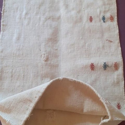 Anatoliske uldsække til korn, bedst kendt under det tyrkiske navn 'chuval', blev tidligere ofte set i landsbyer. Som praktiske genstande var de ofte lavet af ufarvet stribet uld, en typisk egenskab ved nomadiske transporttasker fra Marokko til den vestlige kinesiske grænse. Men dekorerede eksempler som dette, med skiftende bånd af sumakh og farvet ensfadet væv på den ene side og elfenbensfarvet skiftende med farvet ensfadet væv på den anden, findes i mange samlinger af anatoliske vævede tekstiler.
