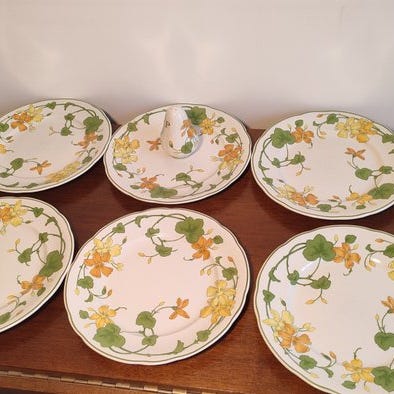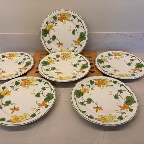 Seks tallerkener fra den populære serie „Geranium“ fra Villeroy & Boch. Tallerkenerne har en diameter på ca. 21 cm og egner sig både som morgenmadstallerkener og kagetallerkener. Håndmalet med gule blomster og grønne blade på en cremefarvet baggrund. På undersiden er hver mærket: Villeroy & Boch, Made in Germany, Håndmalet, opvaskemaskinefast.