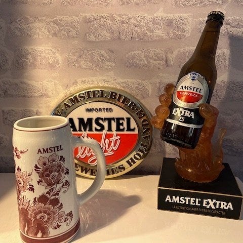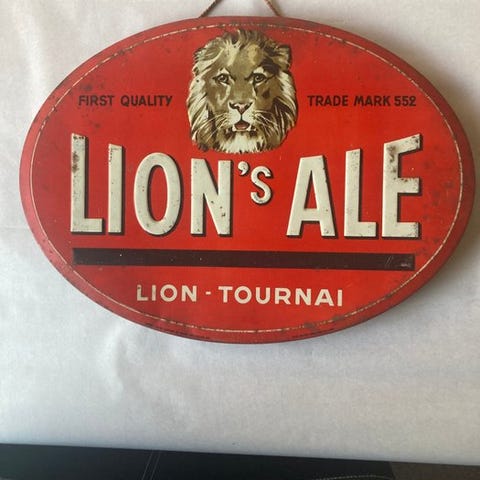 Gammelt belgisk ølreklameskilt af metal. Tegningen er stadig synlig, og teksten nederst er stadig læsbar, desværre er den engang blevet slebet. Har tjent som falsk væg i en gammel café. Taxe Payée Antwerpen 1951. Sjældent lille skilt 'Extra Allies'. Afsendes godt pakket. Et rigtigt stykke reklame- og ølhistorie. Fotos udgør en del af beskrivelsen.