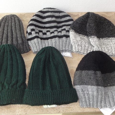 Nye Oldemors hjemmestrikket huer 40 kr stk. Hjemmestrikket halsedisse 35kr stk. Kan sende med DAO 45 kr..