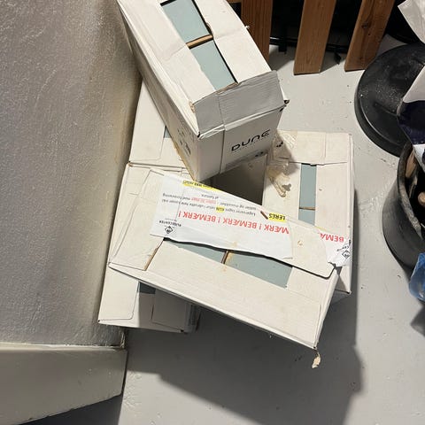 5 pakker nye fliser sælges. Hver pakke indeholder 44 fliser svarende til 0.9 m2. (så alle 5 pakker = ca. 4,5 m2
