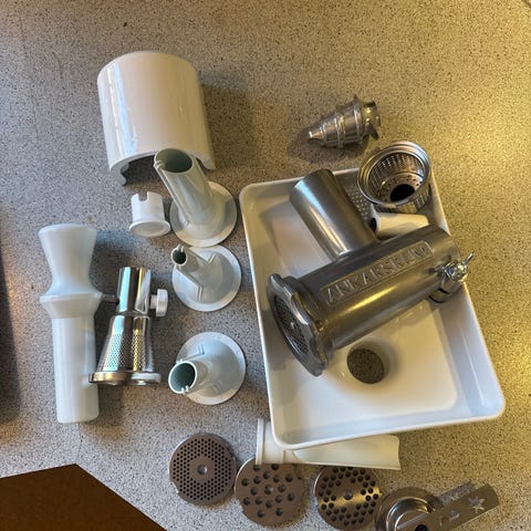 Ankarsrum med kødhakker, pålægsmaskine og rivejern.