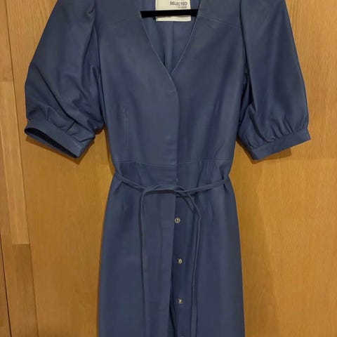 Lækker sort kjole i 100% gedeskind str. 38. Den har en lille bådformet halsudskæring, en lang lidt grov lynlås i ryggen og 2 stiklommer også m. lynlås. Længden fra ærmegabet og ned er 69 cm.