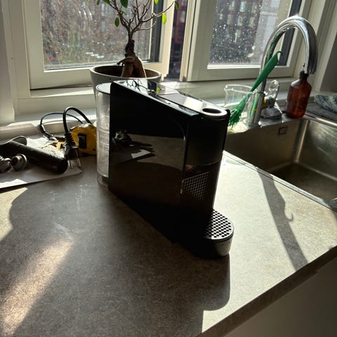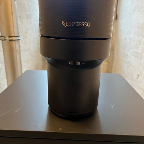 Nespresso kaffemaskine i sort farve. Maskinen er designet til at brygge espresso og kaffe med Nespresso-kapsler. Den har en kompakt størrelse og et moderne design, der passer til de fleste køkkener.