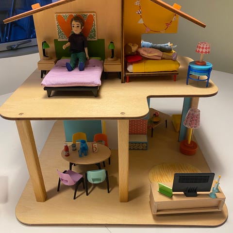 Dukkehus i tre etager med farverigt indretning, der inkluderer møbler som sofa og komfur. Detaljerede vægdekorationer og et lille akvarium øverst med en fisk. Dukkehuset er 49 cm højt, og dets design omfatter buede døråbninger og en trappe. Overfladerne har pastelfarver med mønstre som striber og prikker, og der er en terrasse øverst.