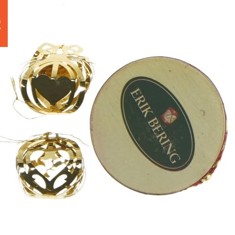 Objektet består af to gyldne dekorationer med hjerte- og stjernedesign, placeret i en rund æske med røde og musiknoterede detaljer. Æsken har en diameter på 6 cm og æysesragen er mærket Erik Bering.