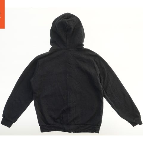 Sort hættetrøje med lange ærmer og hætte. Forsiden har et stort kraniemotiv lavet af små, skinnende nitter.