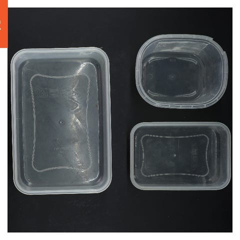 Sættet indeholder 5 plastikopbevaringsbeholdere, hver måler 20x15x9 cm. De er gennemsigtige med sorte håndtag og har etiketter til mel, pasta og sukker. Etiketterne kan fjernes og udskiftes. Beholderne har visse overfladepletter og mærker, som kan være tegn på brug.