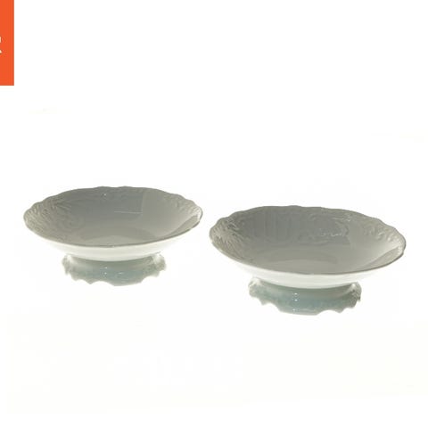 Disse to porcelænsfade på fod har en diameter på 19 cm. De har et dekorativt mønster langs kanten og et stabilt fundament, der løfter dem lidt op. Perfekt til servering af desserter eller frugt.