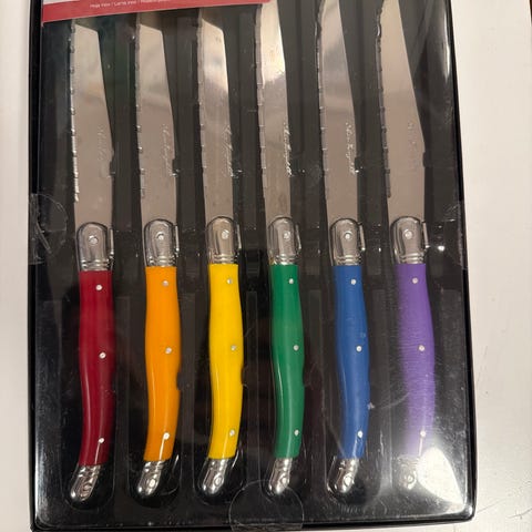 Dette sæt indeholder to steakknive, hver med en længde på 22 cm. Knivene har skarpe, takkede blade og sorte håndtag med tre nitter. De er ideelle til at skære gennem steak og andre typer kød. Håndtagene giver et godt greb og kontrol under skæring.
