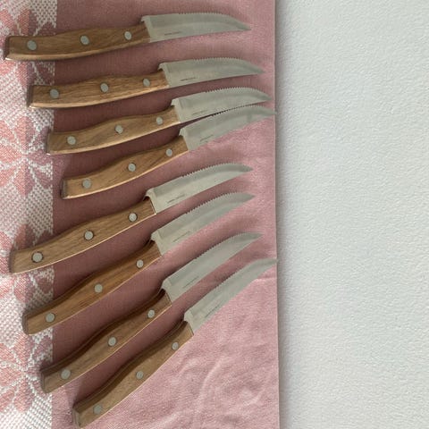 Dette er et sæt med fire nye bøfknive med sorte håndtag og serraterede klinger. Knivene er designet til nemt at skære gennem kød og er ideelle til brug ved middagsbordet. Håndtagene er nittet fast til klingen. Knivenes længde er 21,5 cm.