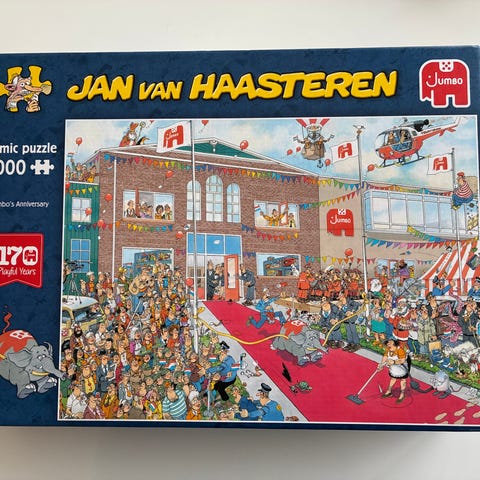 Jan van Haasteren cruise ship puslespil med 1000 brikker. Puslespillet har et komisk tema og kommer med en puslespil plakat inkluderet. Boksen er illustreret med det færdige puslebillede og medlemmer af Jan van Haasteren familien. Produktet er fra Jumbo og måler 25x25 cm.