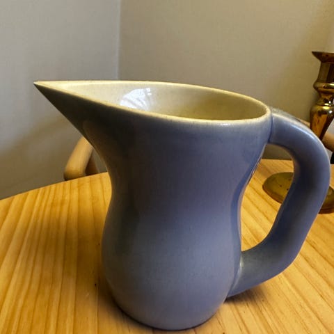 Denne kande er lavet af keramik og har en elegant buet form. Den er primært grå med en indvendig beige farve, og måler 13 cm i størrelse. Kanden har et bredt håndtag og tuden er designet til nem hældning. Der er et Kähler-logo på bunden og siden af kanden.