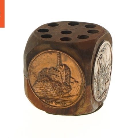 Objektet er en antik kuglepenholder i oliven træ formet som en terning med dimensionerne 6x6x6 cm. Den har flere huller på toppen til opbevaring af kuglepenne. Siderne er dekoreret med indgraverede motiver i kobber, muligvis af historiske bygninger eller landskaber i Jerusalem. Bunden er beklædt med grøn filt for at beskytte overfladen.