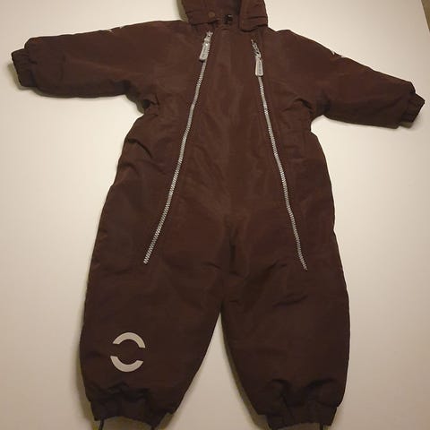 En brun heldragt til børn med hætte og lynlås foran. Dragten har elastiske manchetter og reflekterende detaljer langs lynlåsen og hætten. Der er også fodstropper for bedre pasform.