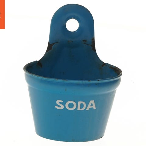 Denne vintage vægholder er lavet af metal og har en rektangulær form med en buet øvre kant. Holderen er blå og har en perforeret dekorativ kant på fronten. Den har et hul til ophængning på en væg. Der er synlige tegn på rust og slitage på kanterne.