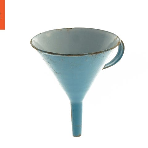 Tragten er konisk formet med en diameter på 11 cm og en længde på 13,5 cm. Den har en blå ydre og en hvid inderside. Hank og snor er fastgjort til tragten, hvilket gør den nem at hænge op eller håndtere. Der er tegn på slid og rust langs kanterne.
