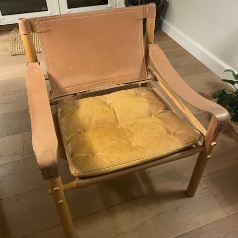 En ægte skandinavisk designklassiker – inspireret af den engelske safaristol, men med Norells karakteristiske kombination af varmt træ, smukt patineret læder og håndværksmæssig præcision.