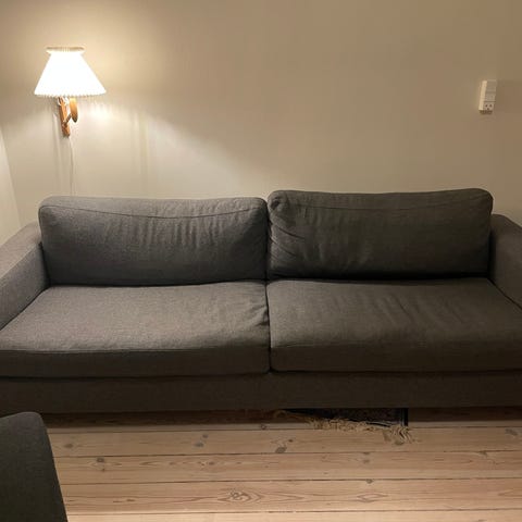 Fin sofa i funktionsmæssig fin stand. Der er dog et hul under sofaen, der ingen funktionel betydning har og nemt kan fikses. Herudover en lille skramme i stoffet yderst i venstre side.