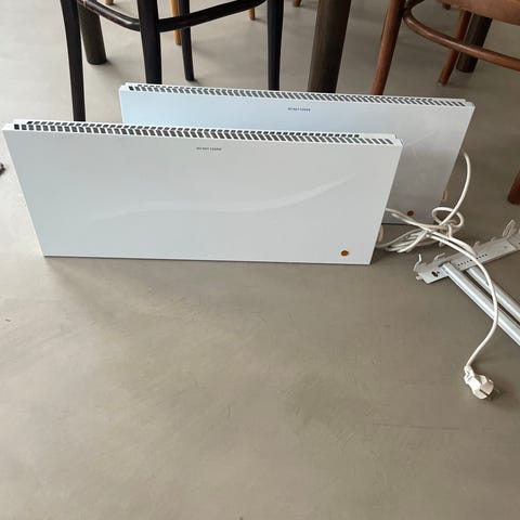 Bright. Måler 95 x 29 cm. Med beslag går den 8 cm ud fra væggen. Panelovnen er designet til vægmontering og har et slankt, rektangulært design. Den er udstyret med stik og termostat til regulering af varme. Velegnet til opvarmning af mindre rum. Er i Ellinge Lyng. Men tages med til Kbh på søndag den 25.1