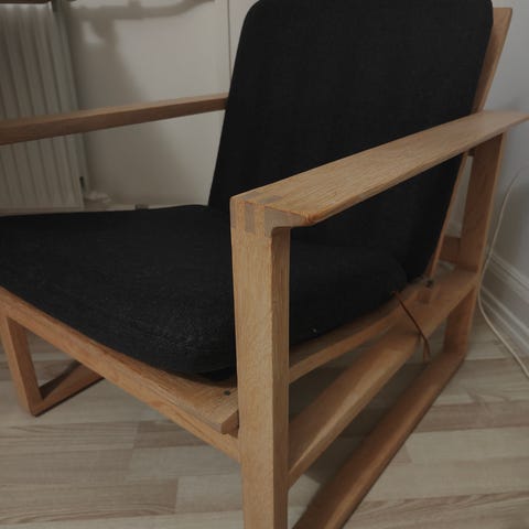 Fremstillet hos Fredericia Furniture. Renoveret. Sæbebehandlet egetræ og nye hynder med lyst møbel uld stof med brune læderstropper.
