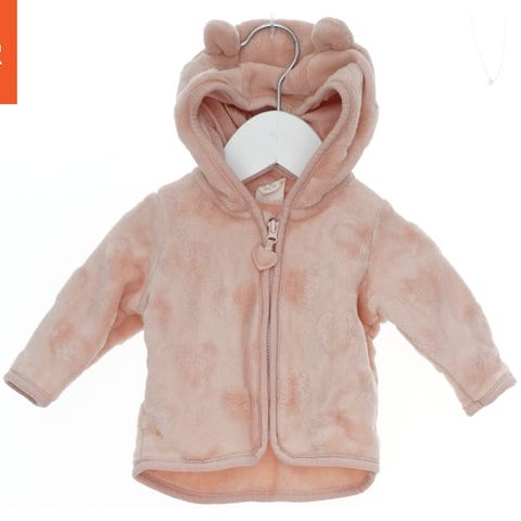 Fleecejakke i rosa farve med lynlås foran. Den har to lynlåslommer foran og et logo på brystet. Jakken har en høj krave og lange ærmer.