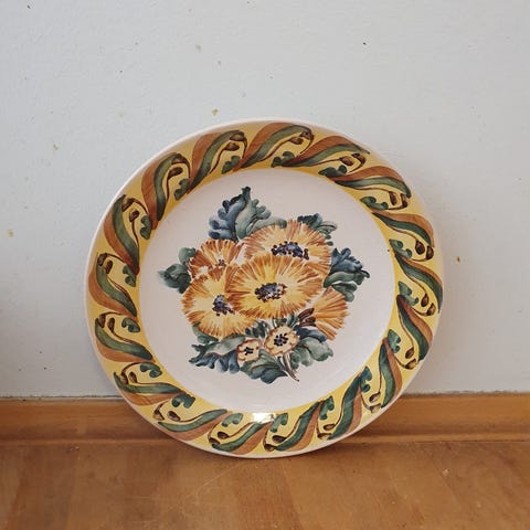 Vintage tallerken. Meget dekorativ Lars Syberg tallerken (dyb) med håndmalet blomsterdekoration i midten og gul og brunt bladmotiv som kant. Tallerknen er fremstillet i keramik og meget egnet som dekoration på væggen.