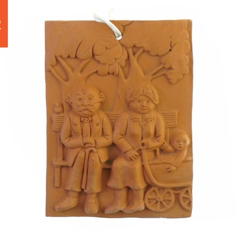Denne messingvægplade har dimensionerne Ø 12,5x1,5 cm og er dekorativt udformet med et relieffmønster, der forestiller en scene med mennesker og genstande i et rum. Den har en blank, gylden finish, og der er monteret en ophængskrog på bagsiden, så den kan hænges op på en væg. Tags: vægplade, dekoration, messing, relief.