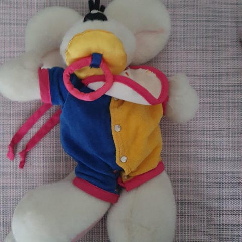 Denne plysmus måler 18 cm i højden og bærer farverigt tøj med gule og lilla detaljer på forklædet. Musen har store lyserøde ører og separate fødder med lyserøde pletter og sorte prikker på sålerne. Musen holder en blå og orange ring med en hvid kugle på enden, der fungerer som legetøj. Der findes en snor bagpå musen, som muligvis kan bruges til at hænge op eller fastgøre legetøjet.