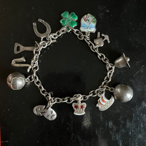 Vintage sølvarmbånd med 9 charms. Længde 20 cm. Lille emalje afslag på studenterhuen - se foto.