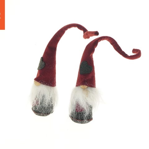 Sæt af to keramiske nissefigurer med glansfuld overflade. Figurerne er iført røde og grønne benklæder med stribede sokker. Den ene nisse holder en kop, mens den anden har en stjerne på maven. De er perfekte til dekoration i juletiden og har en samlet højde på 8 cm.