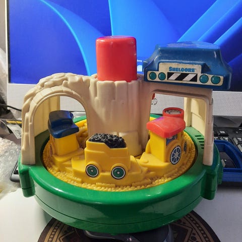 Legetøjstog i farverne rød, gul, grøn, og blå. På togstammen er der figurer af dyr og musiknoter. Der er forskellige formede knapper, som kan trykkes på for at producere lyde eller musik. Der er en snor på forsiden, så toget kan trækkes. Toget er interaktivt og kan hjælpe med at stimulere sensoriske og motoriske færdigheder hos børn.
