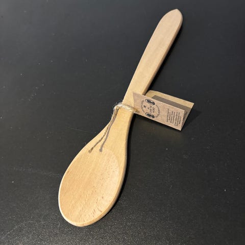 Træske med unikt skæftet, der har en naturlig finish. Den er 15 cm lang, med et skaft lavet af træ og en ske ende skål lavet af en muslingeskal, der har en dekorativ farve og design. Skeens ende virker robust og er fastgjort med metaltråd til skaftet.