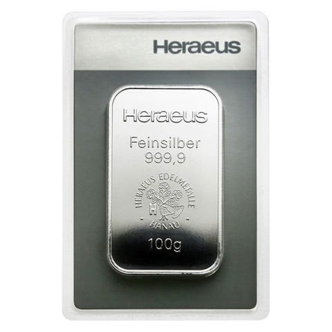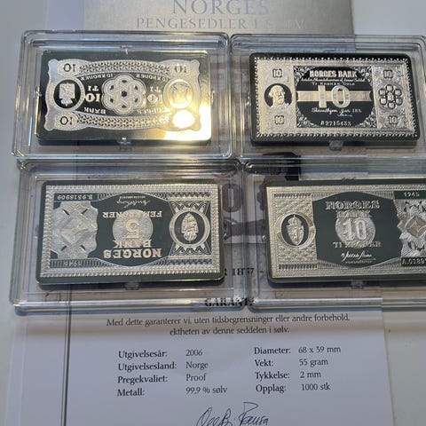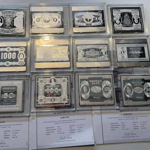 Hver barre er på 1,48 gram ren sølv 999, altså 148 gram ialt.