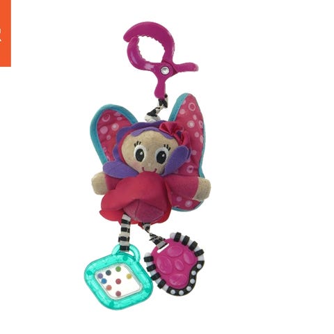 Denne farverige legetøjsfigur er designet som en enhjørning og har en klips, der gør den let at fastgøre til forskellige overflader som en barnevogn eller barneseng. Den er 19 cm høj og lavet af blødt tekstilmateriale. Figuren har en lilla krop med farverige detaljer som en gul horn, pink og blå mønstre, samt forskellige teksturer og mønstre på benene. Legetøjet er med mærket 'Playgro', som er kendt for at fremstille legetøj til små børn.